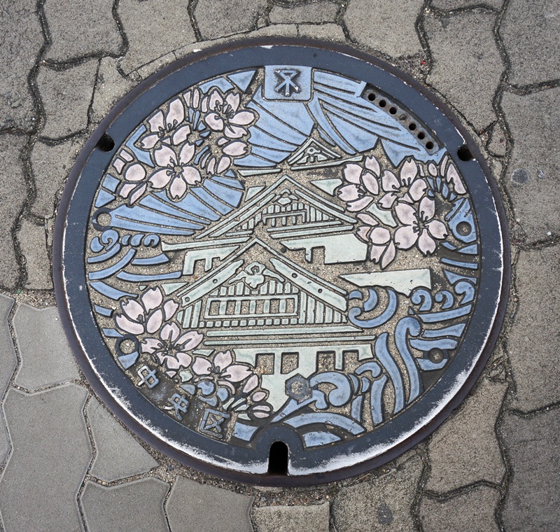 0127 Previous Next Veröffentlicht 2. Februar 2019 in 800 × 760 in Japan – Tag 7: Tagesausflug Osaka – Schloss Osaka, Shinsekai „New World“ und Dotonbori-Flussufer Gullideckel in Osaka zum Schloss